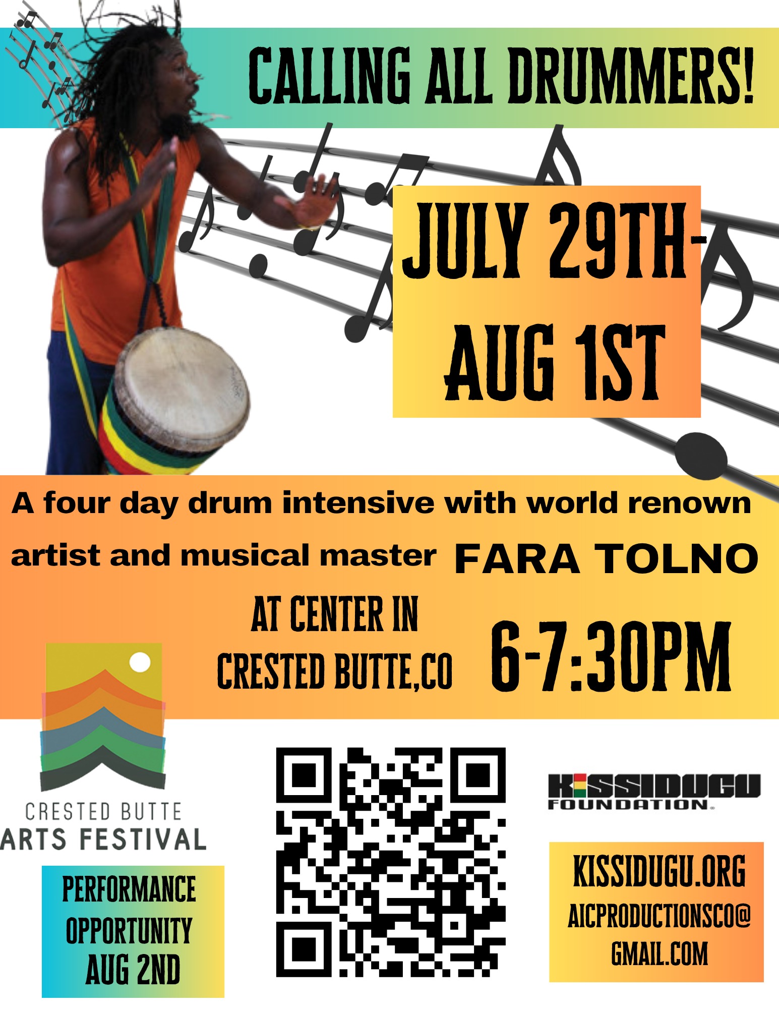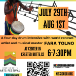 Incredible programs and opportunities happening throughout Colorado! Fara Tolno will be teaching throughout CO July 28th-August 17th! Check out what’s happening and get the details below: