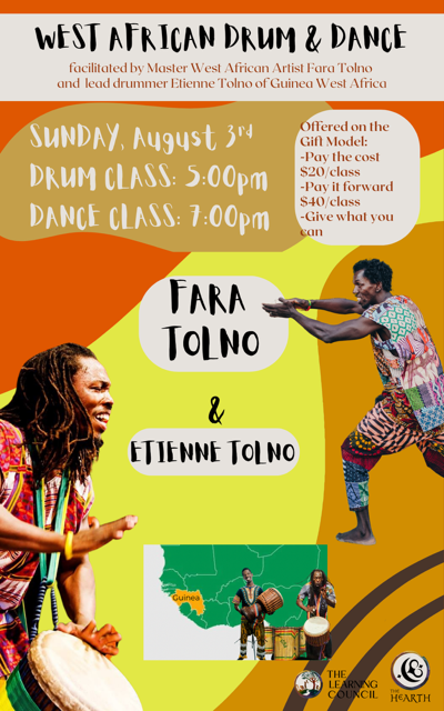 A three day drum intensive and dance workshop with Fara Tolno on August 8th-10th. Friday night drum and dance classes, Saturday will feature two 2-hour drum studies and two 2-hour dance intensives with an evening meal and dialogue covering the history, culture and background of Guinea rhythms with a Q&A with Fara. Sunday will culminate in a dual 2-hour class for dancers and drummers, giving drummers an opportunity to learn further techniques for playing for dance classes. Register HERE