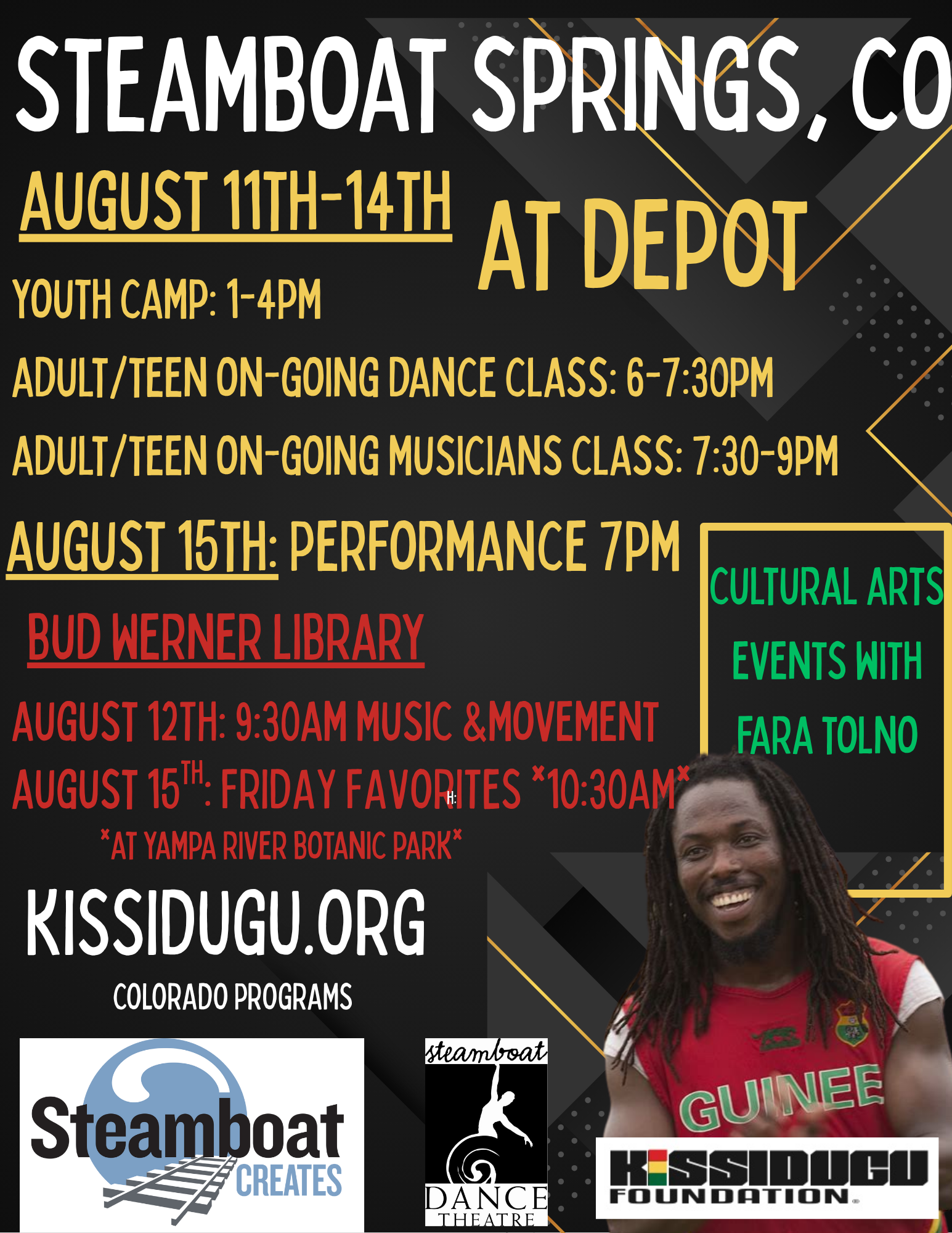 August 11th-14th: Youth Camp, On-going Musicians Class and On-going Dance Class at Depot in Steamboat Springs